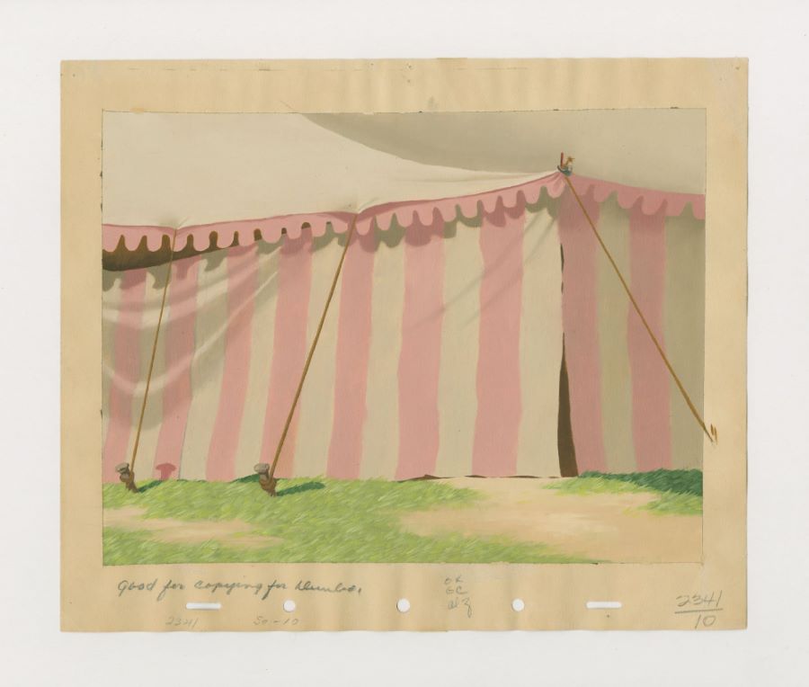 A production background from the Disney Studios animated Goofy short titled "The Big Wash" (1948). Featuring a whimsical image of a circus tent, the hand-painted background was created at the studio and used during the animation process. The background is an actual frame of animation that was photographed and appears in the short. Measuring 10"x12" overall, with the image itself measuring 8"x10.5", the background is in very good condition with minor discoloration, light adhesive bleed from tape on the reverse causing staining to the front, edge and corner wear, and pinholes through three of the corners from studio use.
